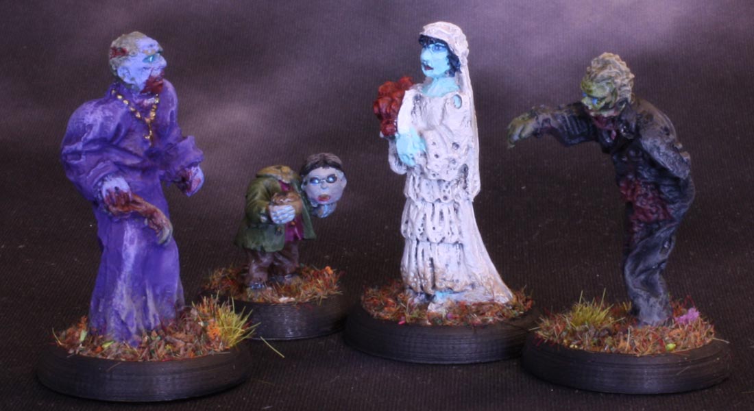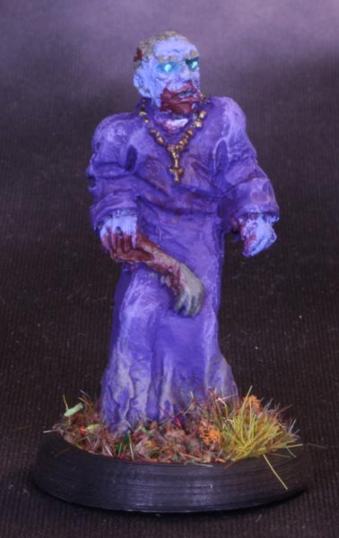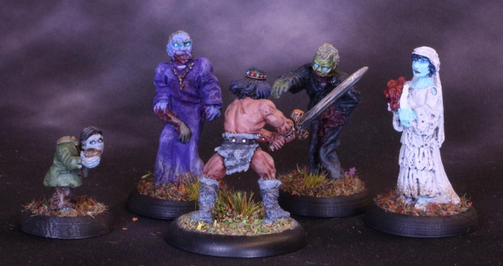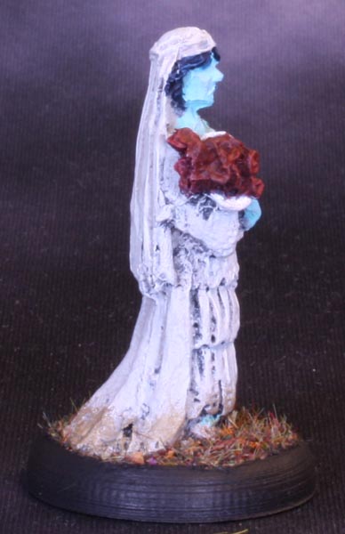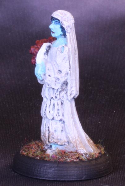 Some time ago, I got some of the white resin Strange Aeons first edition miniatures in a trade forum lot. They are in truth a bit rough in the details, but cool minis all the same. The bride, groom and priest were sold as a set called “zombies”.