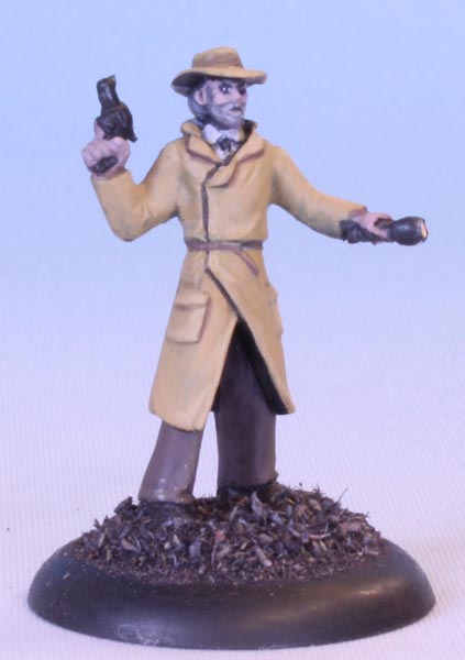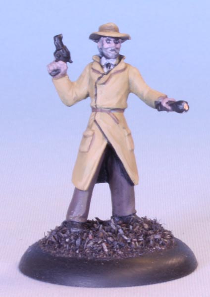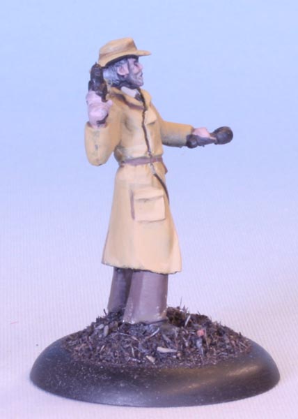e.g. brown with some white makes beige, add a little orange to make the perfect buff trenchcoat colour. Add a little purple to this to make caucasian skin colour. Add a little white for highlights. Light grey for the shirt, black revolver and torch. A spot of white, then orange, then more white, wet-in-wet makes a good torch lens. Greys for the five o’ clock shadow. The lightness of the top grey makes him look older.