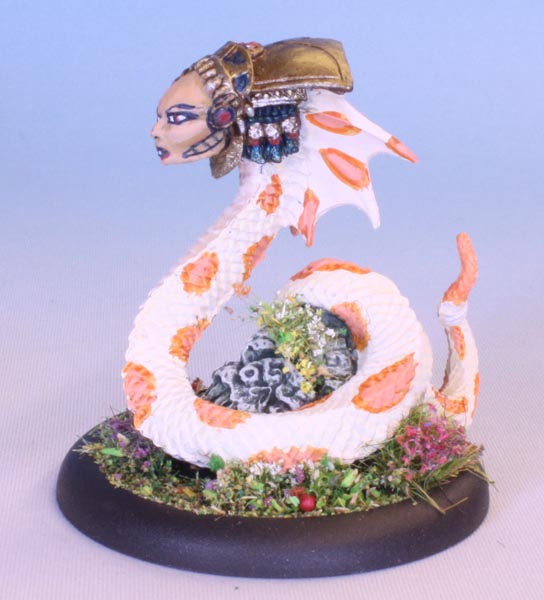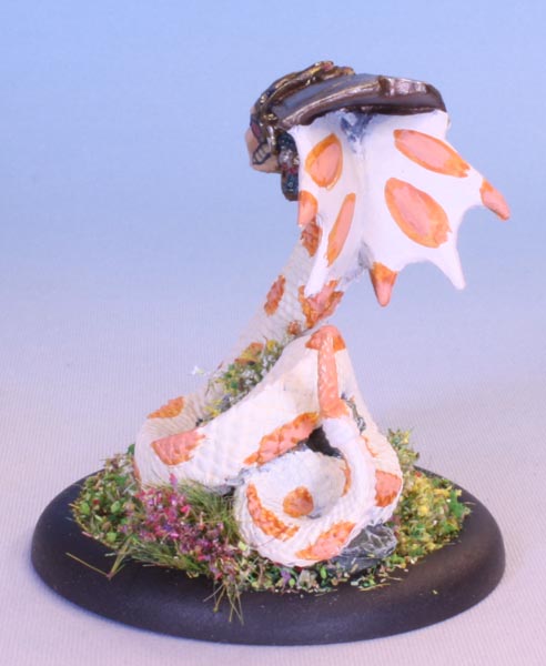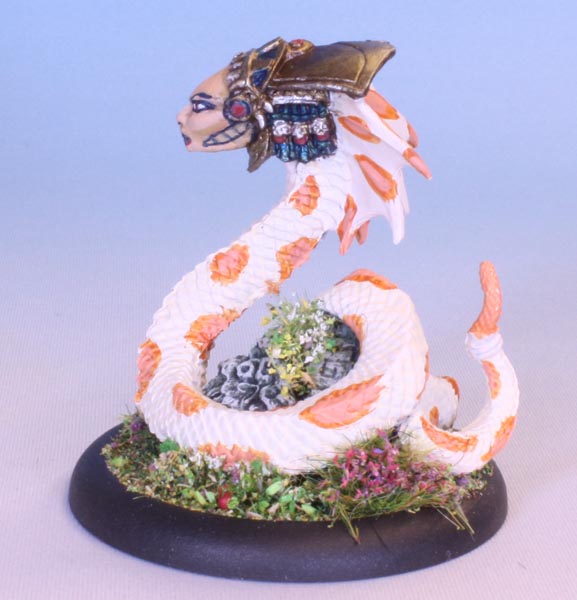 The snake colours are inspired by an albino anaconda. I was thinking of an albino ball python, but seeing as this Naga was made to look Pre-Hispanic South American I went with the anaconda, seeing as it is native to that region and the Python is not.