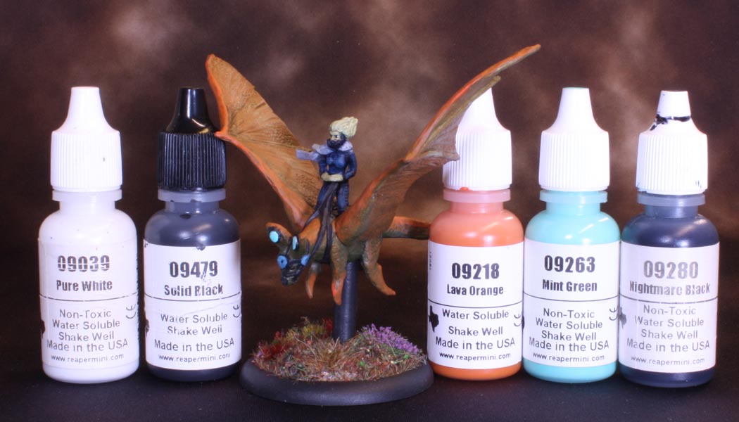 I used Nightmare Black, which is a very dark blue that mixes beautifully to lighter blues, while Mint Green is more of a light turquoise that goes to sandy yellow(!) when mixed with the Lava Orange and a spot of white, so I can get both flesh colours and blondish hair by mixing those carefully. (Actually, sloppily. Mix to see what I get, use some black or white to darken or lighten until something useful shows up.) It is a very good way to learn your paints and get an innate understanding of colour theory.