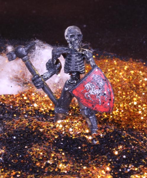 Lots of golden glitter in two tones mixed up and spread thickly to cover the models’ bases make them look standing naturally, and some black glitter carefully sprinkled to mark a cone-shaped burn pattern. The white stuff is cotton wool that is pulled into thin clumps with whispy strands and placed around the back of the cone.