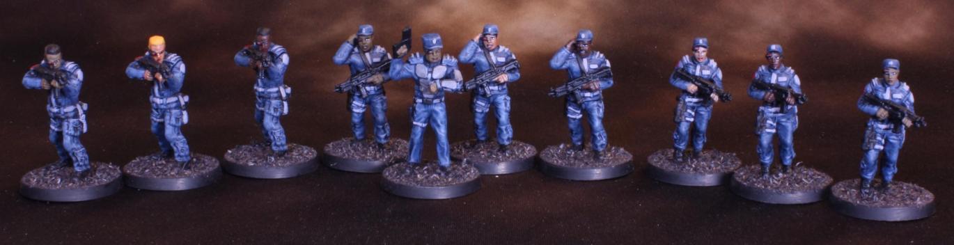The nine Corp Security Guards flanking their villainous boss, Guard Commander Graves.