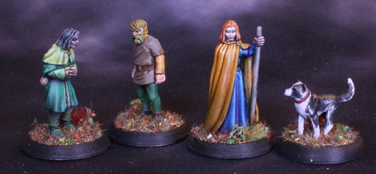 Three townsfolk from the Bones 5 townsfolk set, plus the dog from 44114 Isobael the Bard