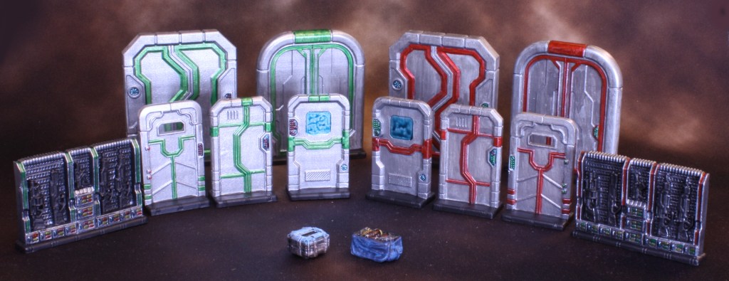 I had hoped to get all of this done before the turn of the month, but it was not to be. It spilled over into July, and today I painted the doors and the last two minis, and based the lot of ’em. So now I am done with them.
