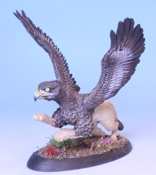 This is an old metal Harlequin Miniatures Gryphon (that they spelled Griffon) from their Fantasy Armies Monsters line. I bought it when new in the late 1990s, and it is yet another mini that I salvaged from the lead rot pile. I fixed it up with a spot of acrylic paste, printed an oval base for it and gave it a lick o’ paint.