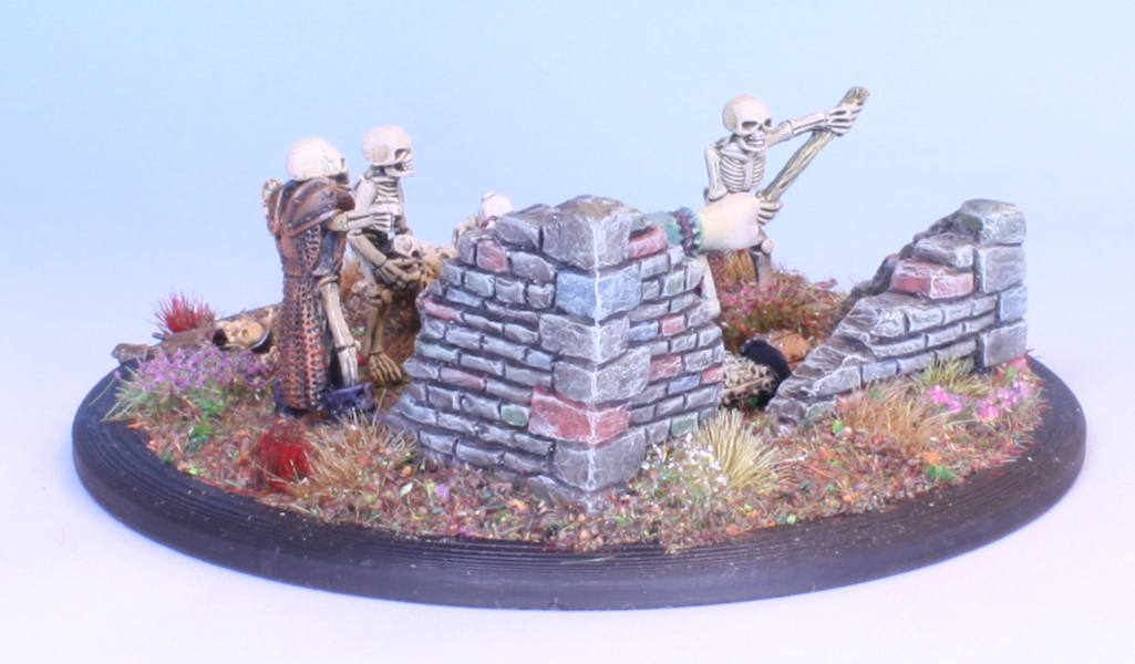 On the base is also half a Mantic skeleton, two resin ruined corner-walls by Oathsworn and a skull-covered cavalry base of unknown make I had lying around. All permanently mounted on a 120mm diameter base I printed for the purpose.