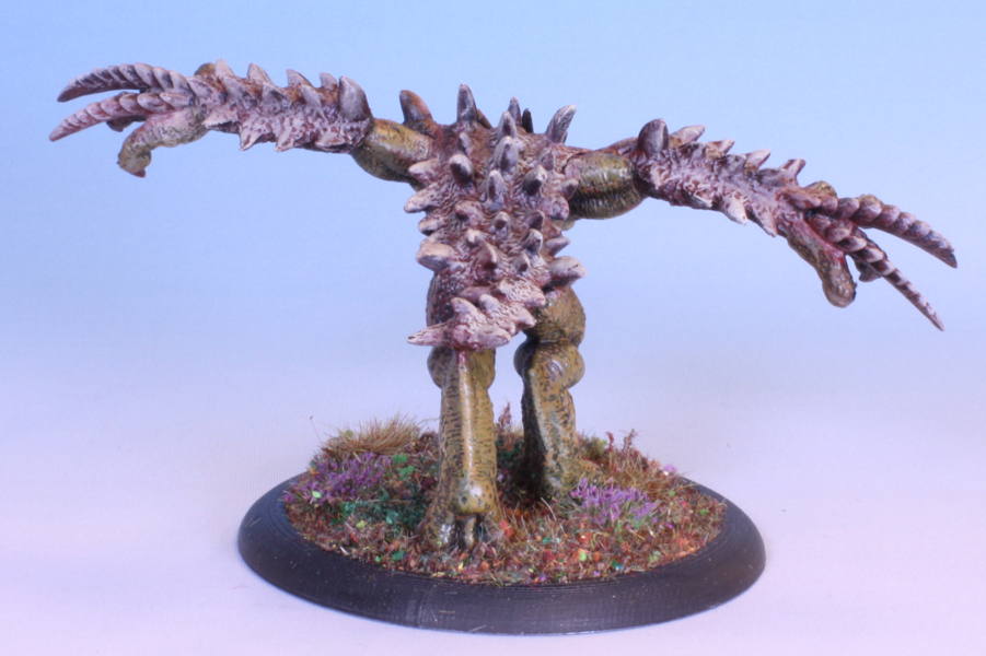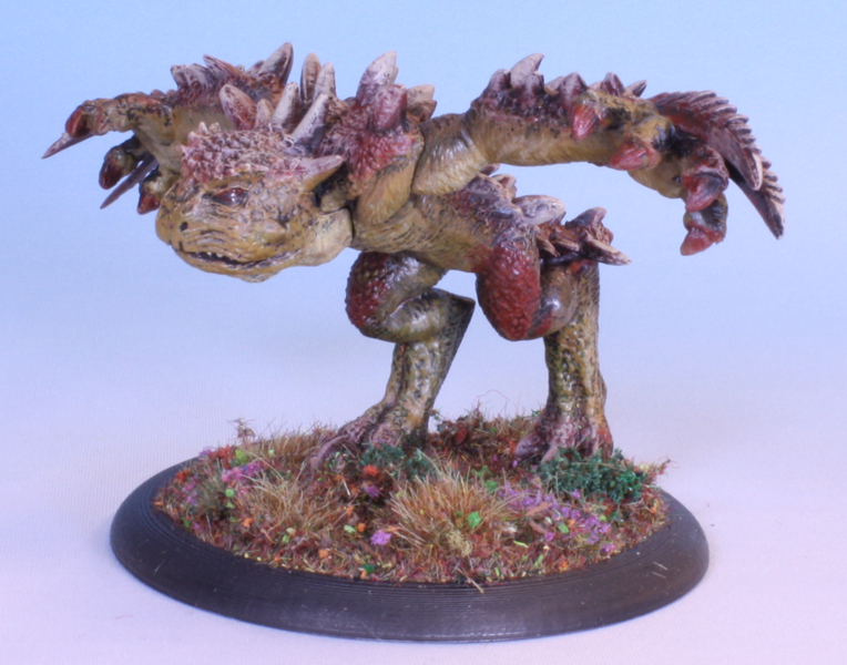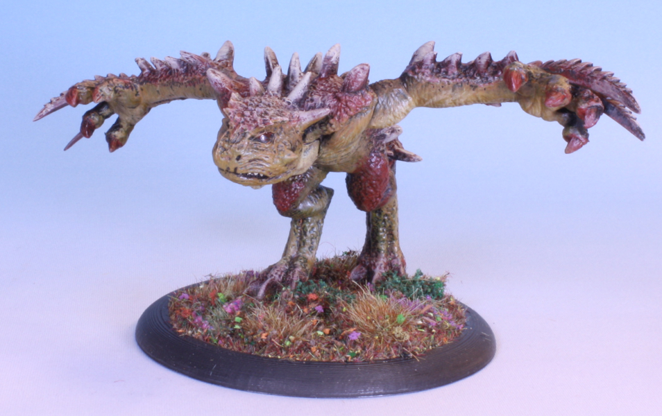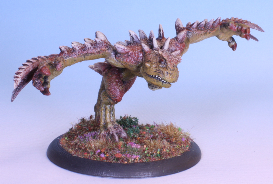 Enough is enough. I just slapped some browns, yellows and reds on and did some sloppy brushwork to get it done. I have come to detest painting masses of horn or spikes, so they were especially quick, which is plain to see. Nothing to be proud of, but nothing to be particularly ashamed of either.