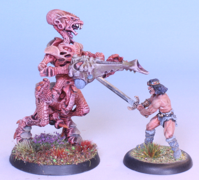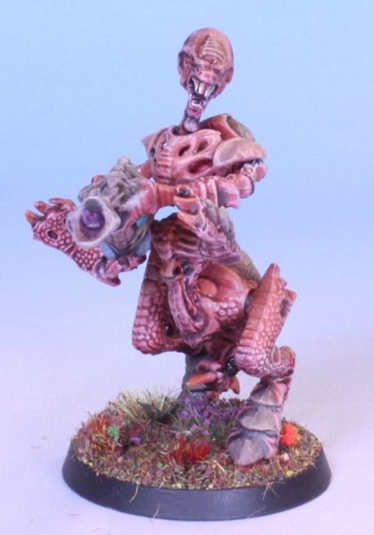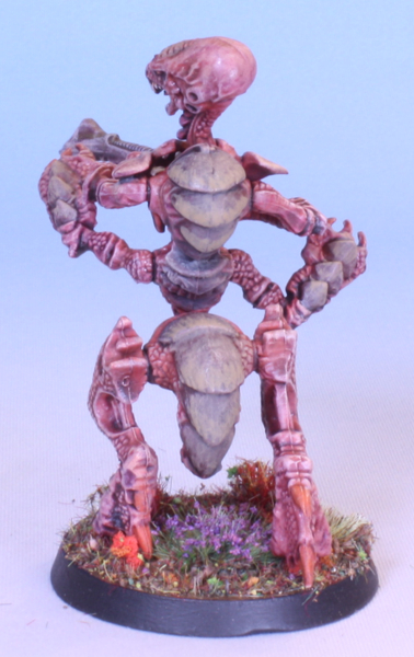 An old-school plastic Tyranid Warrior from the game Advanced Space Crusade, but with a modern 40mm round base instead of the original 25mm square. Also, painted in a modern style.
