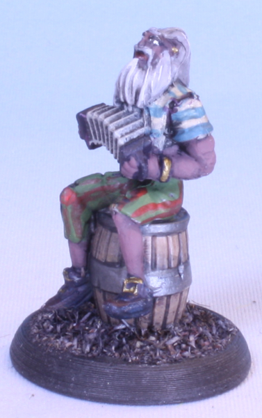 Old man pirate playing concertina sitting upon a barrel o’grog singing Yo Ho Yo Ho A Pirate’s Life For Me. (ditto)